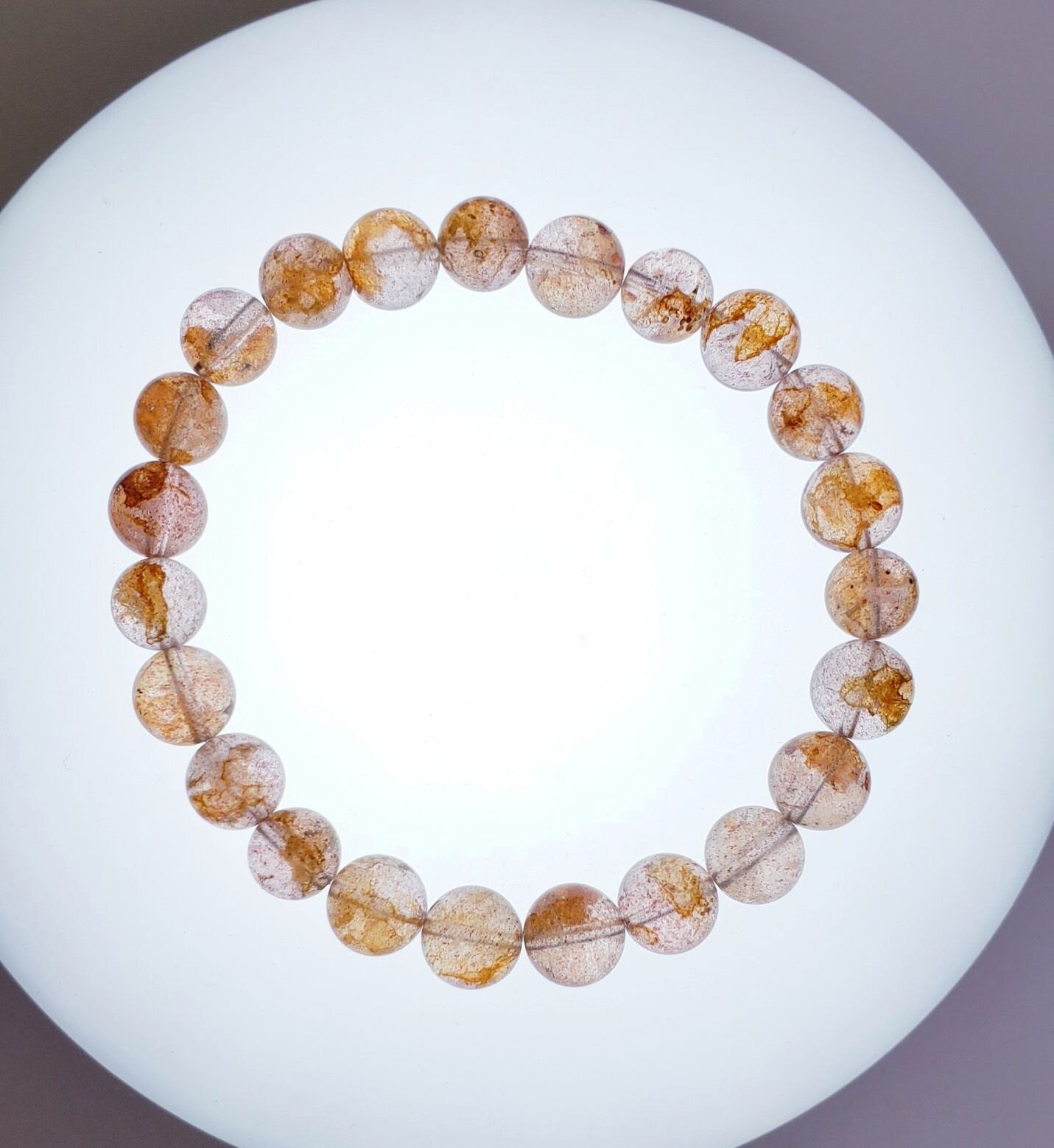 水晶のクラックにヘマタイトや褐鉄鉱(ライモナイト)が染み込んで、赤やオレンジの膜を作る天然石です。